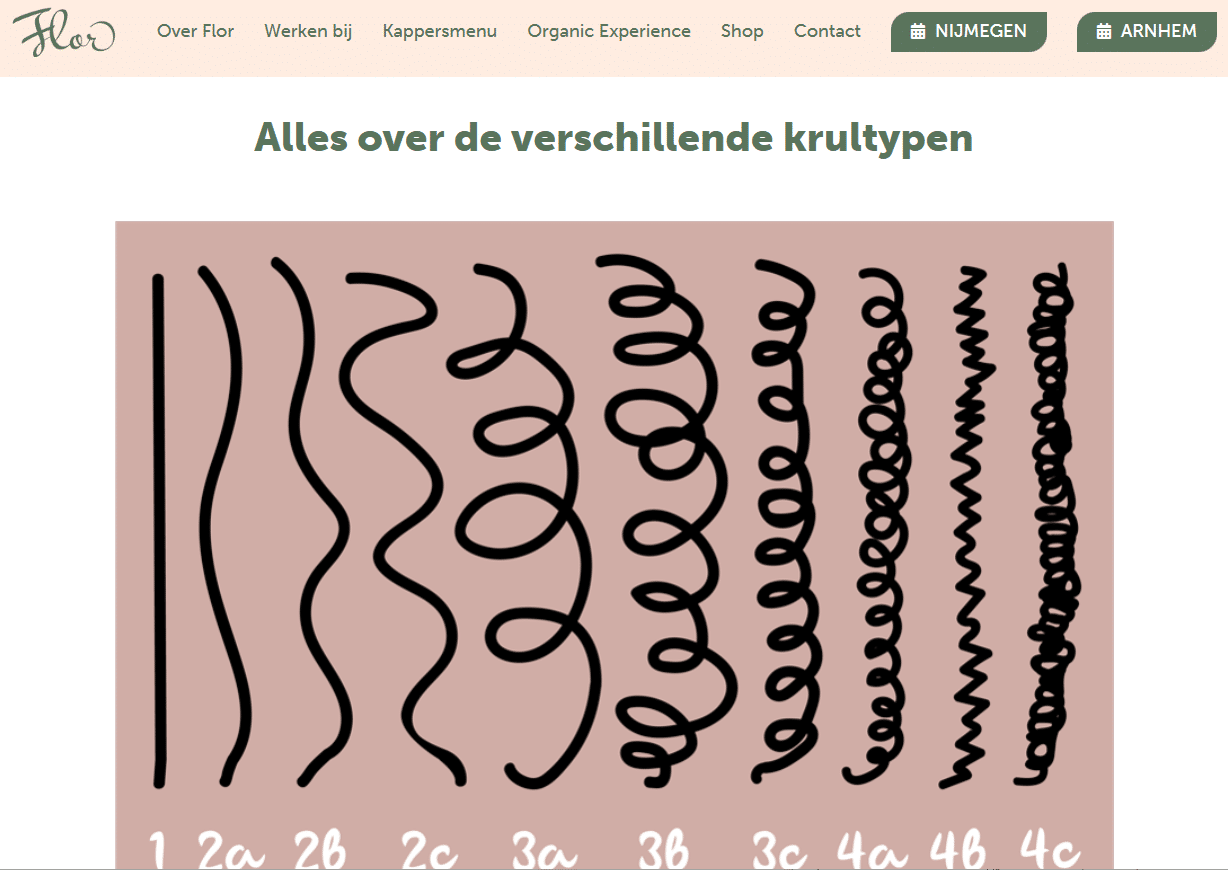 Salon Flor, een kapsalon in Nijmegen en Arnhem, deelt op haar blog bijvoorbeeld handige informatie over krultypen voor haar klanten.