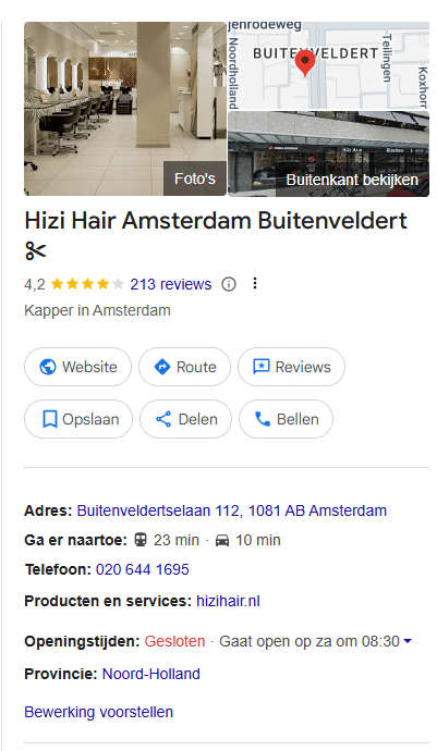 Mensen zoeken vaak naar een salon in de buurt. Jij kunt heel makkelijk zorgen dat jouw salon tijdens die zoektocht in de buurt oppopt, inclusief je openingstijden, website en contactgegevens. Hoe? Door je salon aan te melden op Google Bedrijfsprofiel. Als mensen dan zoeken op jouw bedrijfsnaam, zien ze alle benodigde informatie meteen rechts staan. Dat ziet er bijvoorbeeld zo uit: