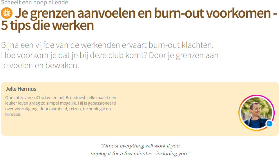Dat betekent niet dat een zakelijke blog onpersoonlijk moet zijn. Sterker nog: voor zzp’ers en kleine ondernemers werkt een persoonlijke toon juist goed. Jij bént je bedrijf als zzp’er en in een kleine onderneming vormen jij en je collega’s samen “de zaak”. Het werkt dan ook altijd goed om voorbeelden uit de praktijk te delen of om vanuit de ik-persoon jouw visie kenbaar te maken. Zo maak je je content herkenbaar en onderscheid je je van anderen.