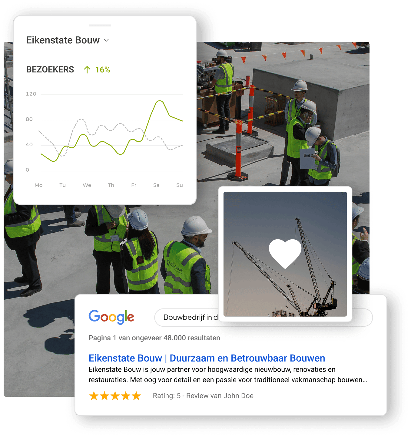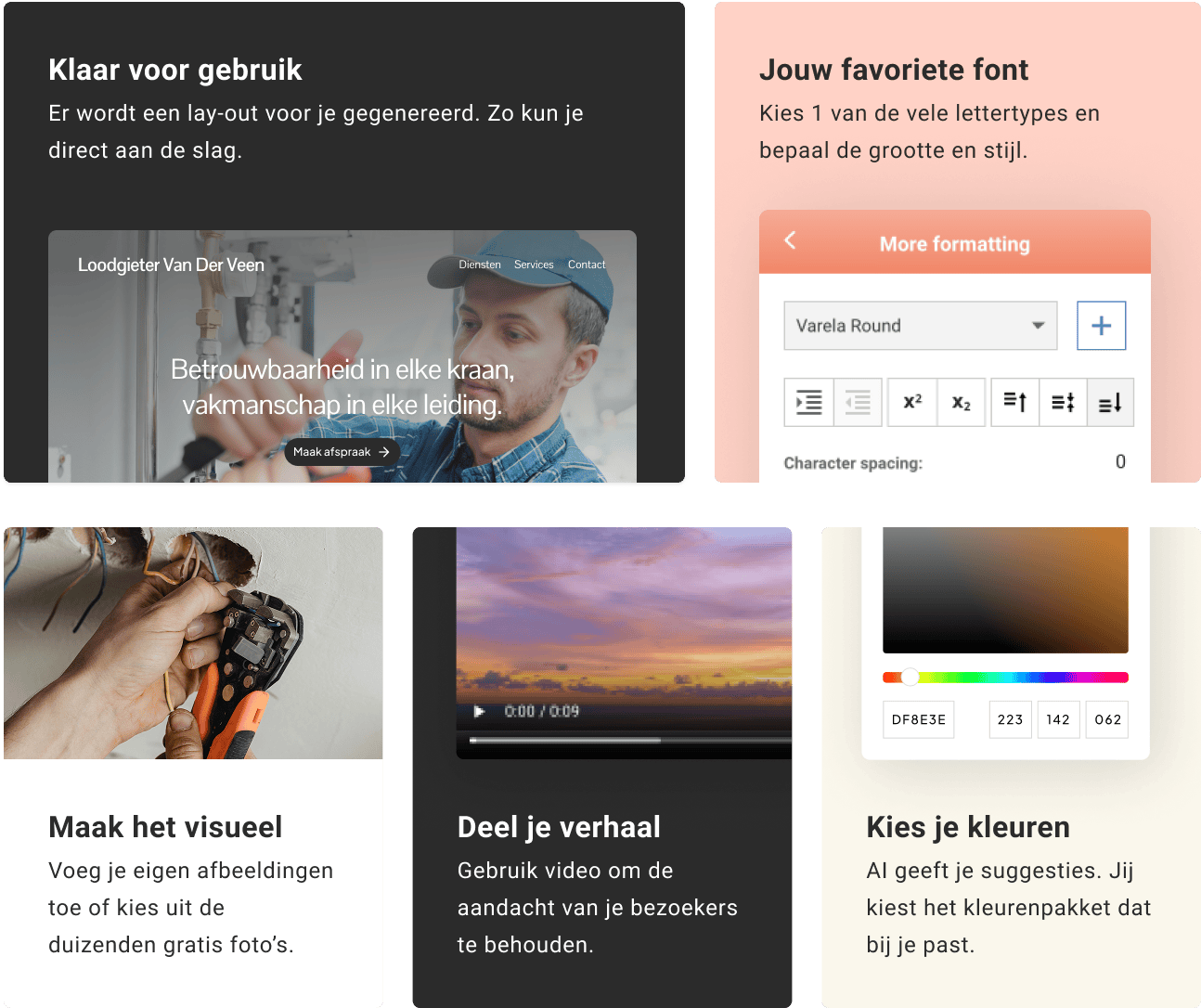 Met behulp van AI heb je razendsnel een eigen website voor je bouwbedrijf. Vertel kort over je werk en laat AI je website voor je bouwen. Pas de kleuren, teksten en foto's aan en voilà! Je bent klaar voor online succes.