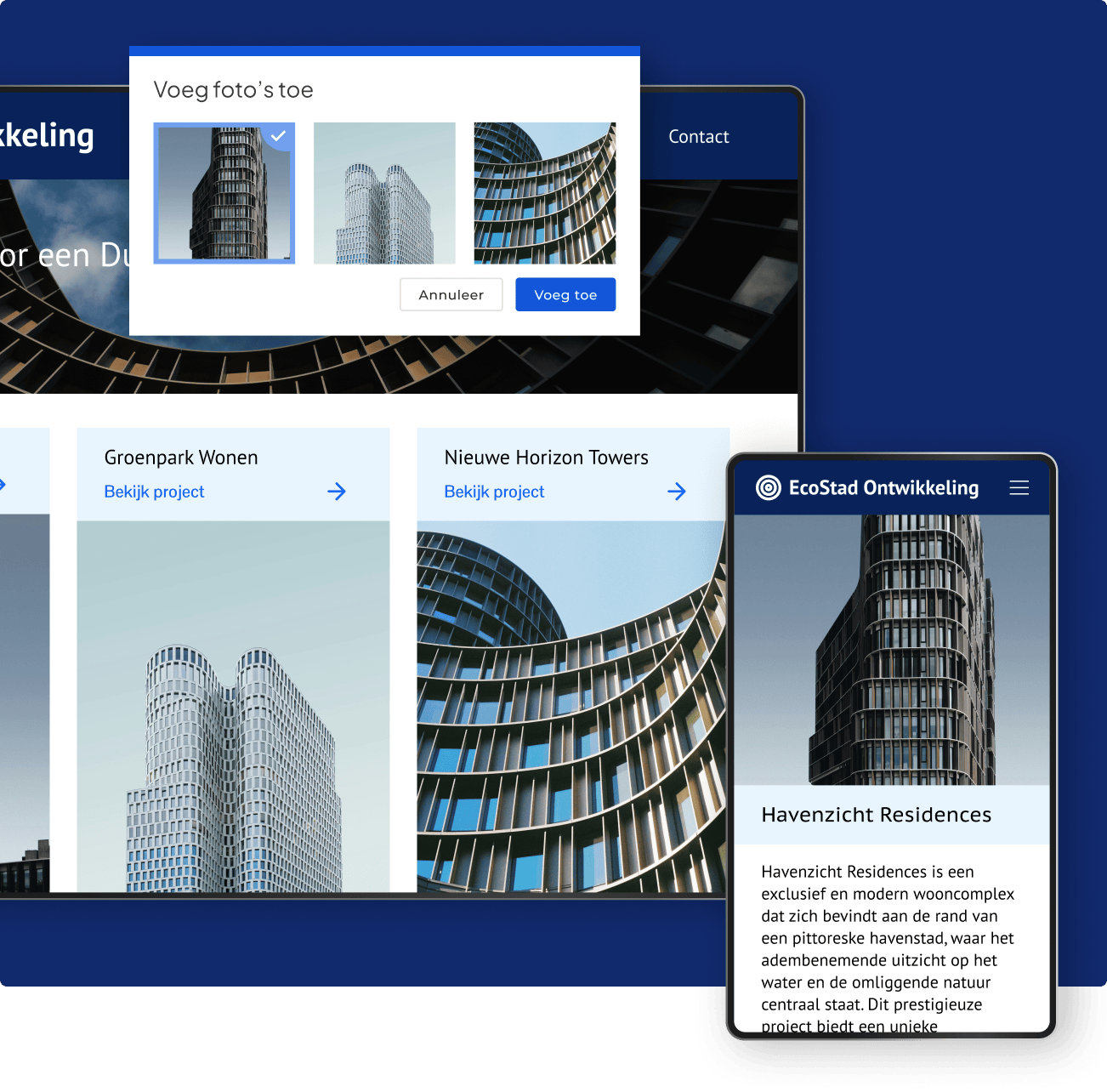 Als professional in de bouwsector, of je nu aannemer of installateur bent, wil je je beste werk laten zien. Voeg gemakkelijk foto’s van succesvolle projecten toe aan je website. Of plaats referenties van tevreden klanten. Zo weet een bezoeker in een oogopslag waar hij aan toe is.