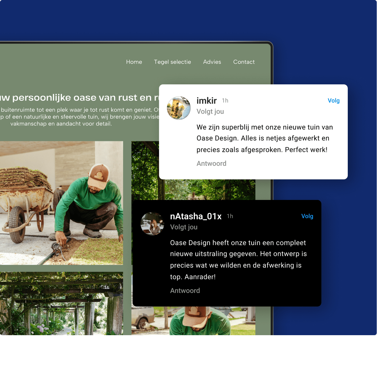 In een paar klikken voeg je jouw Instagram, Facebook, YouTube, Pinterest en/of X-profiel toe. Wil je meer vertrouwen wekken? In 1 klik integreer je Google Reviews. Zo weten klanten dat ze op je kunnen bouwen.