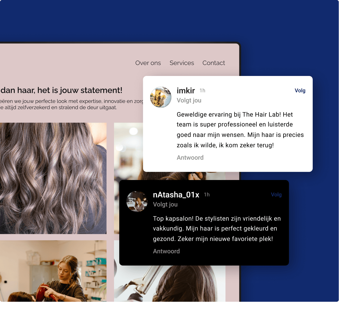Toon je social media-feed op je website en geef je klanten een extra uitgebreide indruk. Voeg bijvoorbeeld je Instagram-profiel of een link naar je YouTube-kanaal toe. Of integreer Google Reviews, zodat klanten meteen de recensies over je kapperszaak kunnen zien.