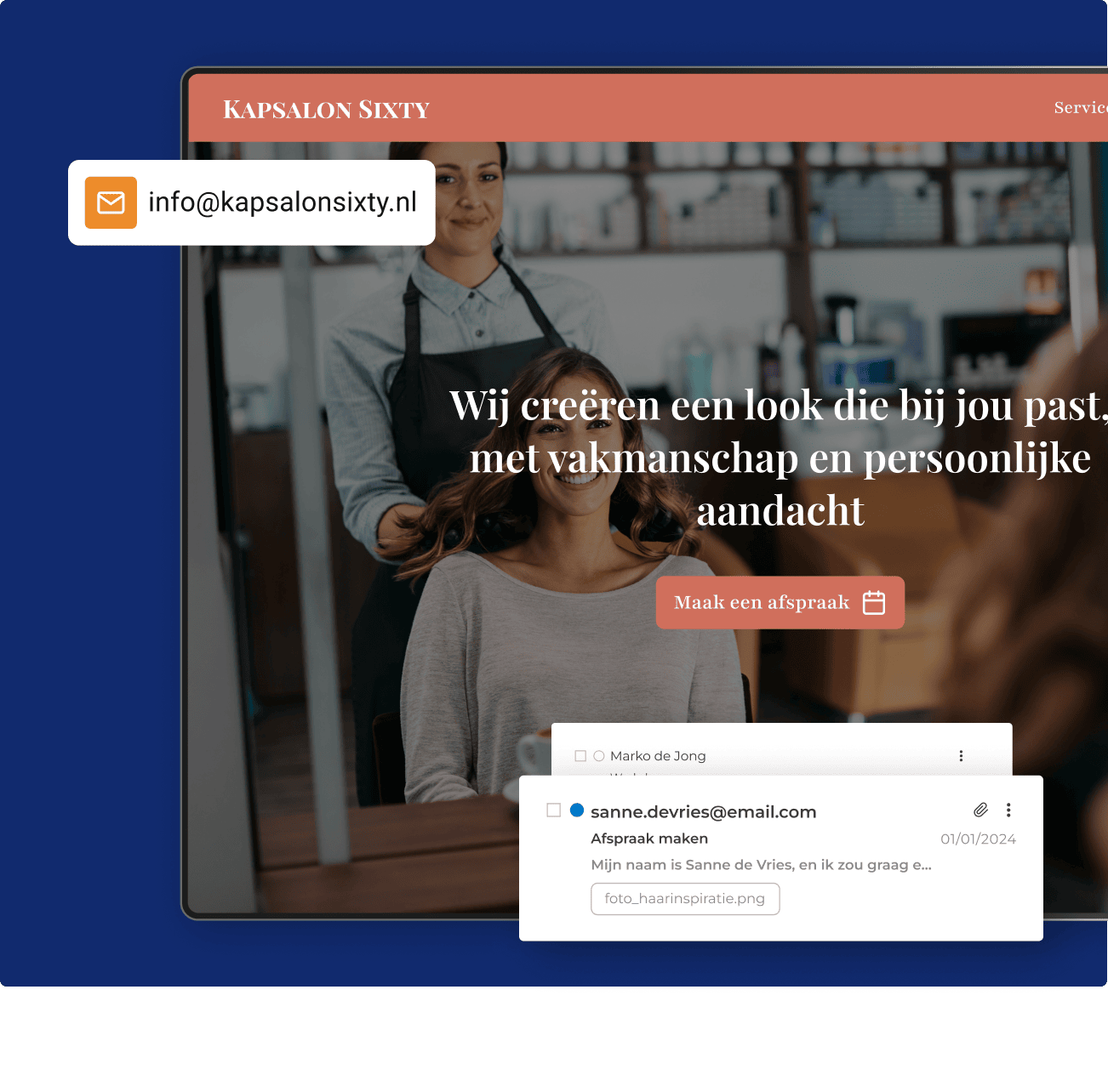 Snel en zonder technische kennis een website voor je kapsalon, geknipt voor jou. Bereik meer met onze alles-in-één kapsalon-oplossing: domein, website en e-mail.