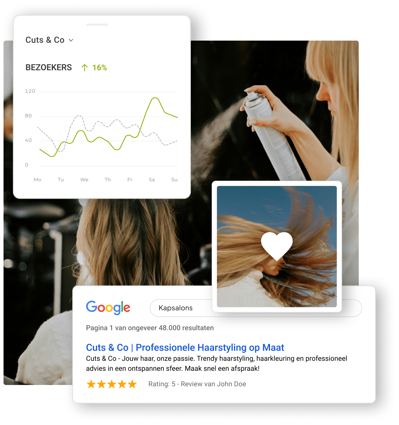 Jij stijlt kapsels, en AI stijlt je website. Geef je naam en gegevens door en laat AI je website voor je bouwen. Pas eventueel de kleuren, teksten en foto's aan en voilà! Je bent klaar voor online succes.