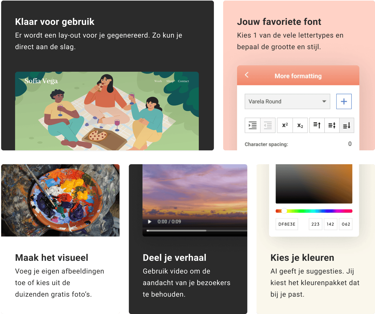Je hebt geen technische kennis nodig. Alleen je creatieve brein. Met de gebruiksvriendelijke tool ben je in een handomdraai online.
