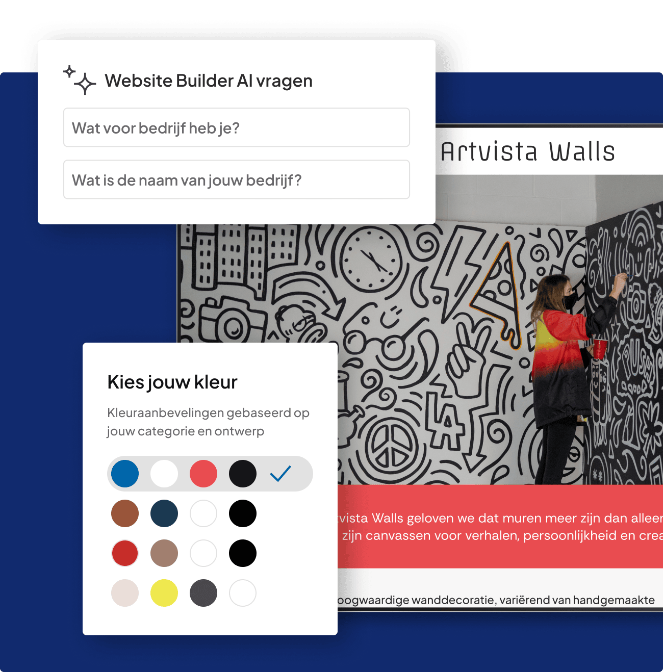Met behulp van AI heb je razendsnel je eigen kunstwebsite. Vertel kort over je werk en laat AI je website voor je bouwen. Pas de kleuren, teksten en foto's aan en voilà! Je bent klaar voor online succes.