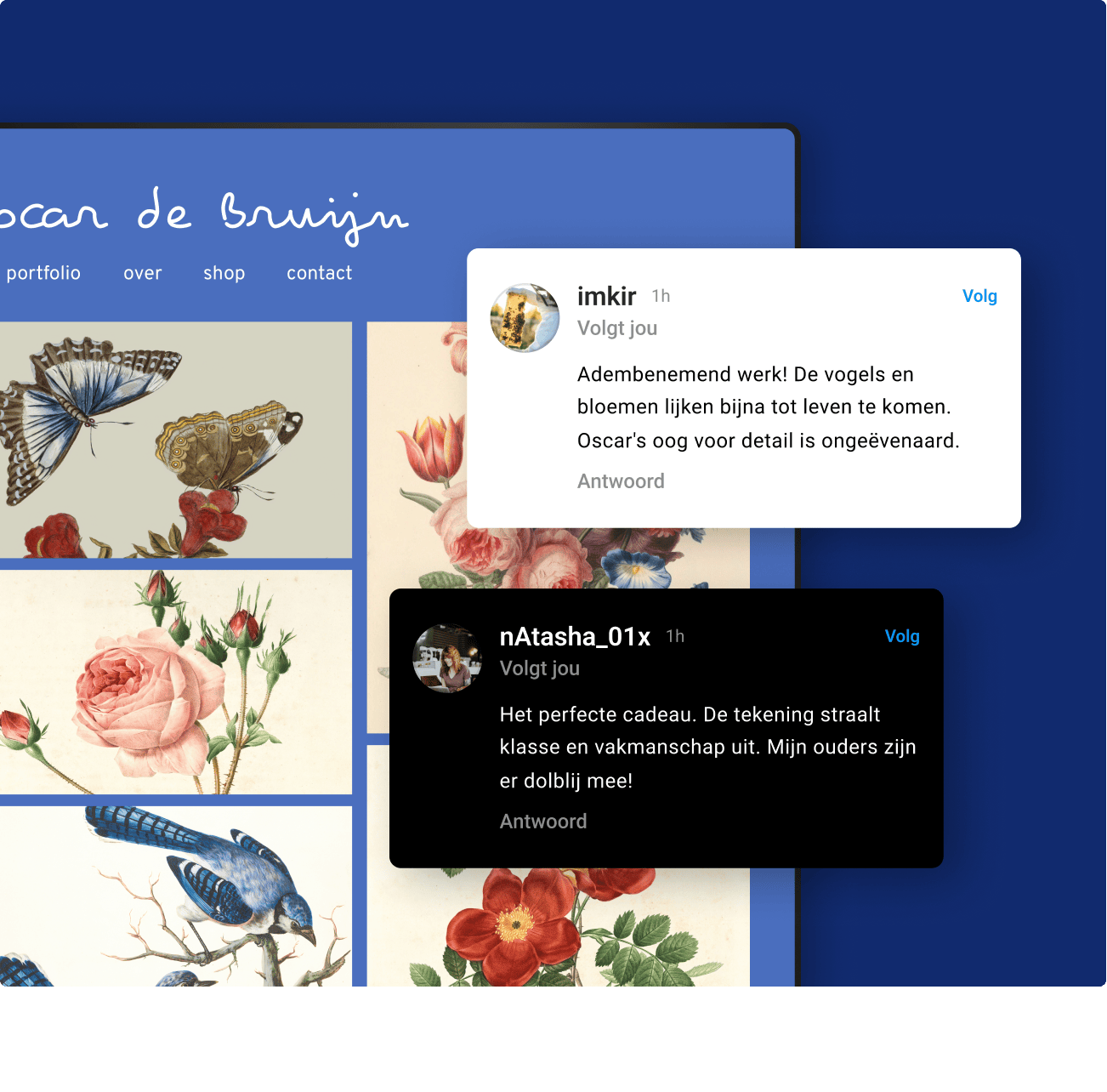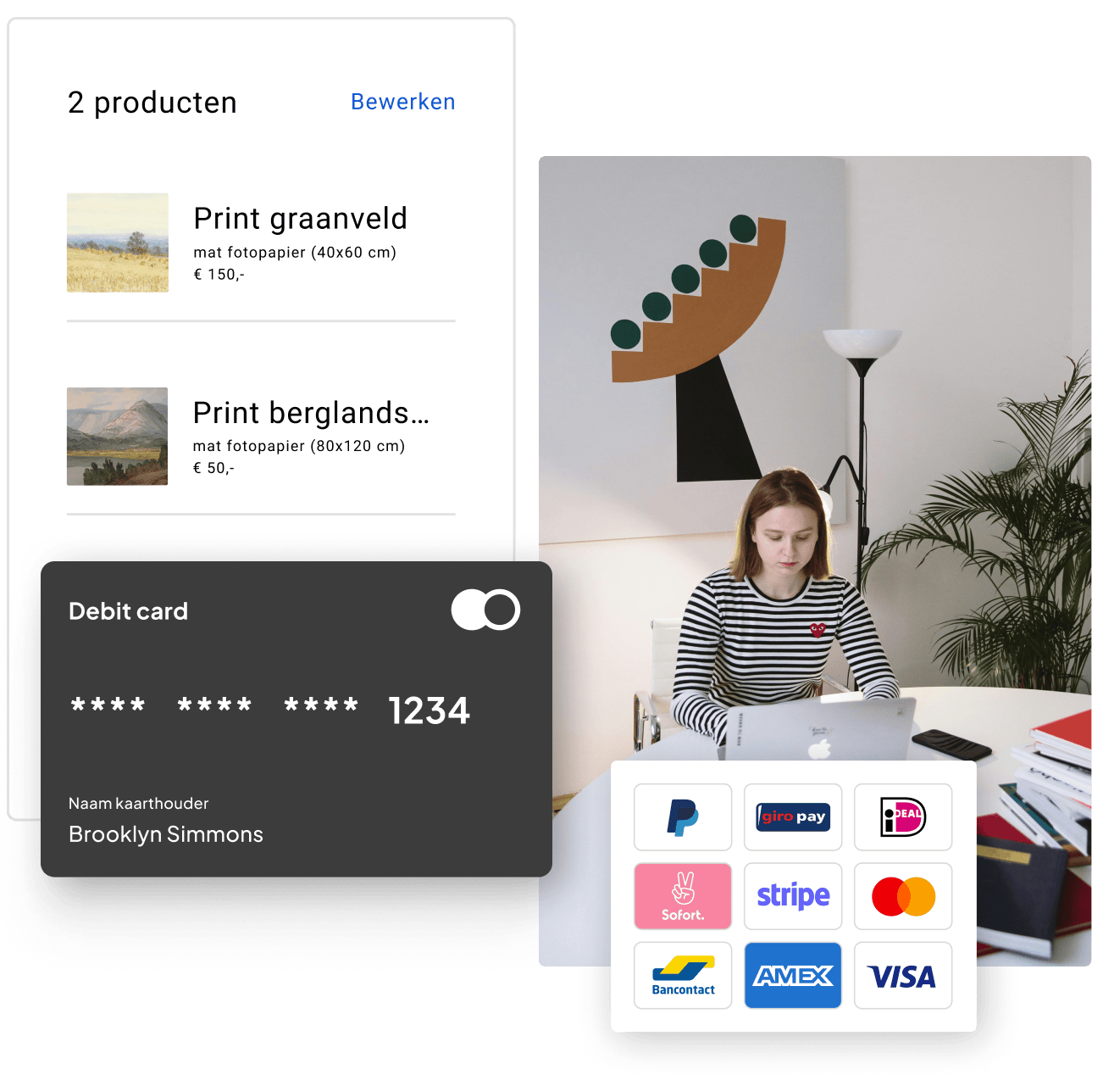 De mogelijkheden zijn eindeloos. Wil je jouw kunst online verkopen? Met de webshop-optie kun je 3 producten verkopen, of zelfs onbeperkt veel producten met Website Builder Plus. Laat je klanten betalen met iDEAL, creditcard, PayPal, Apple Pay en Google Pay. Met Stripe ben je beveiligd tegen fraude.