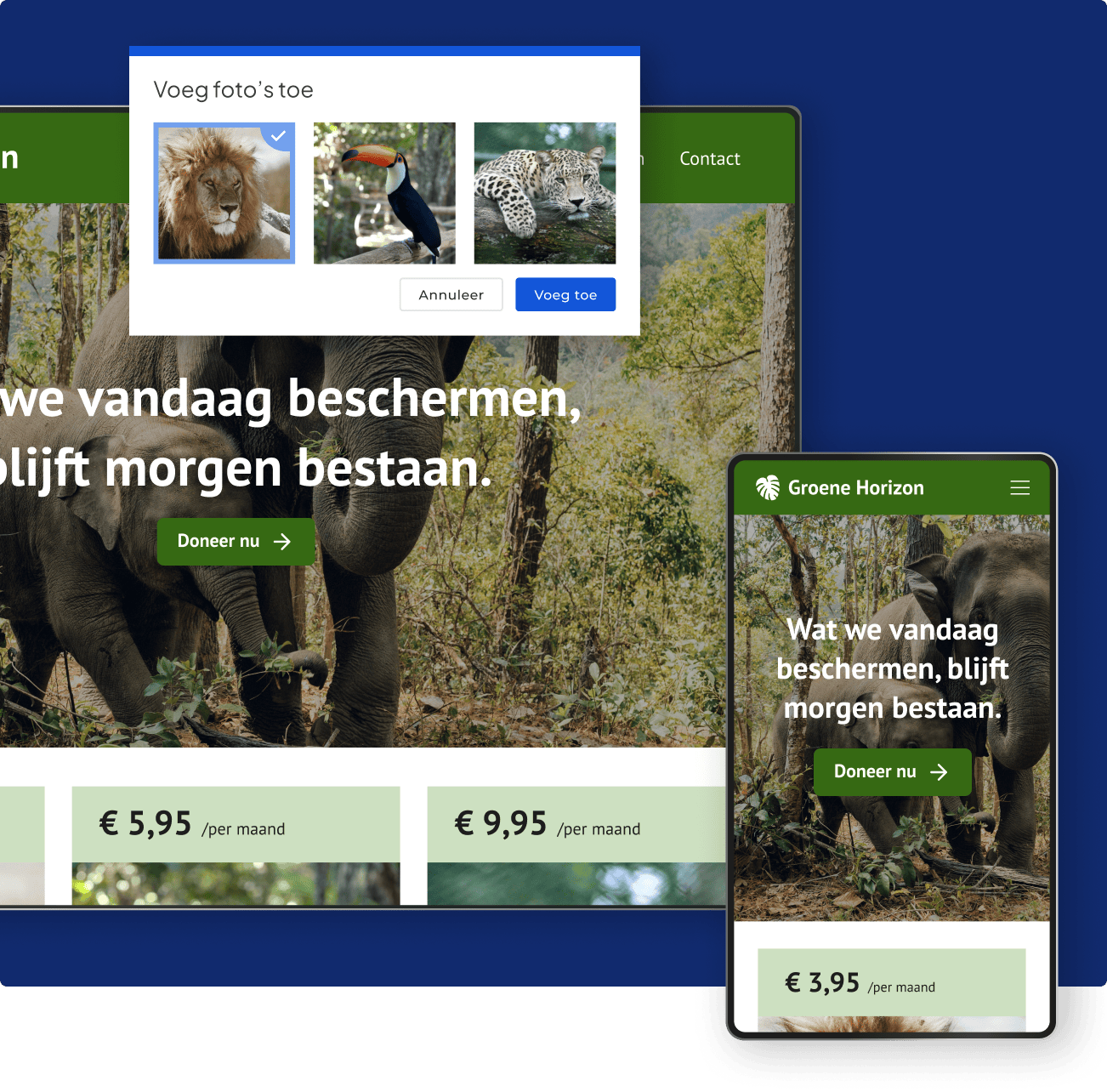 Als stichting, goed doel of non-profit wil je laten zien waar je voor staat. Voeg gemakkelijk foto’s toe van het doel of de doelgroep waarvoor je je inzet. Of plaats ervaringen van donateurs. Zo weet een bezoeker in een oogopslag waar hij aan toe is.