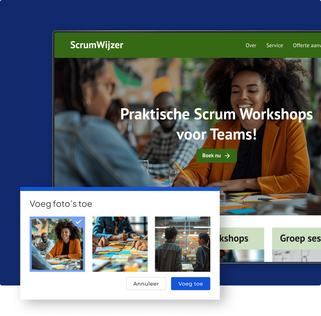 Als freelancer wil je laten zien wat je kunt. Met een eigen website zet je je werk in de spotlights. Voeg gemakkelijk foto’s toe van afgeronde projecten. Zo weet een bezoeker in een oogopslag waar hij aan toe is.